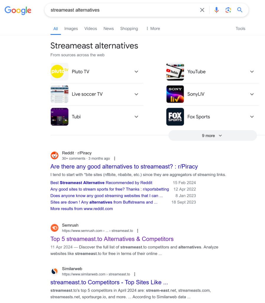 Here is what Google returns when searching for "Streameast alternatives
